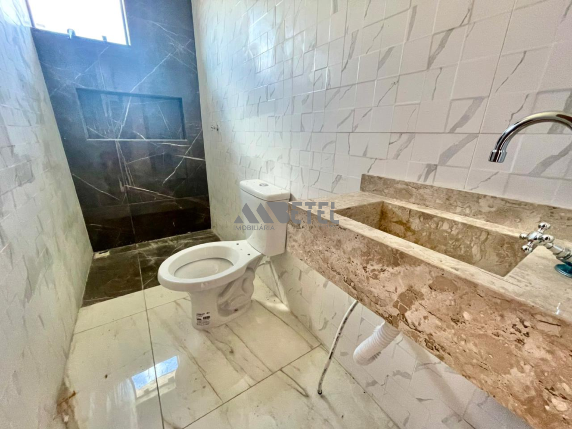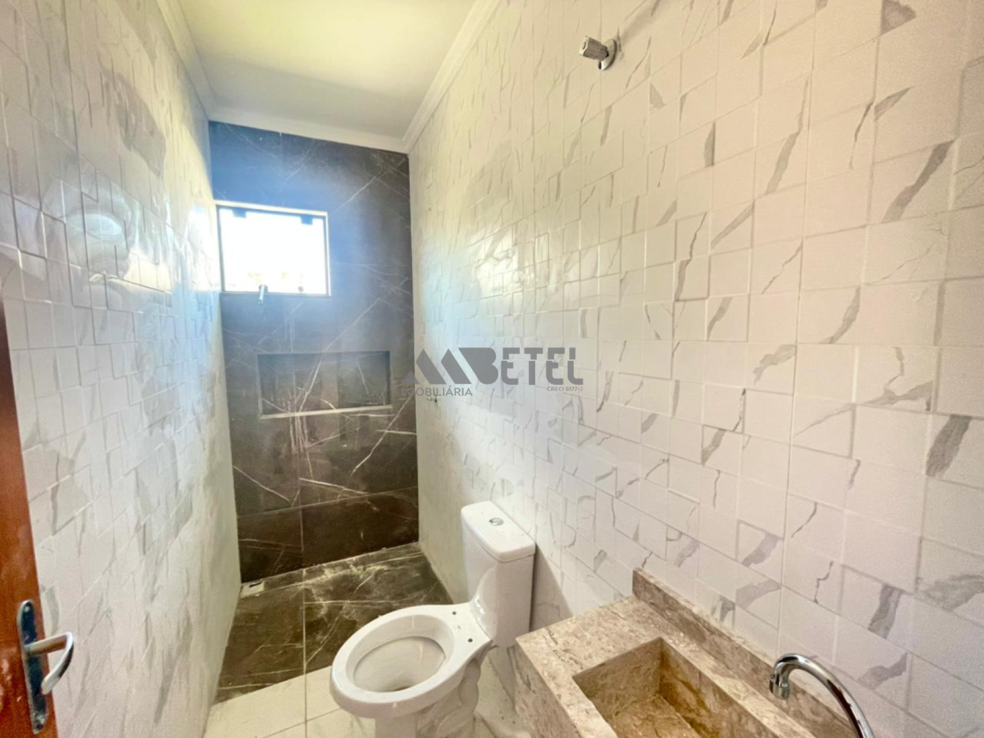 • Banheiro com porcelanato, nicho embutido e pia em mármore